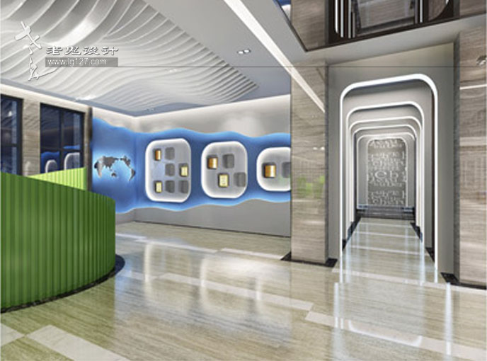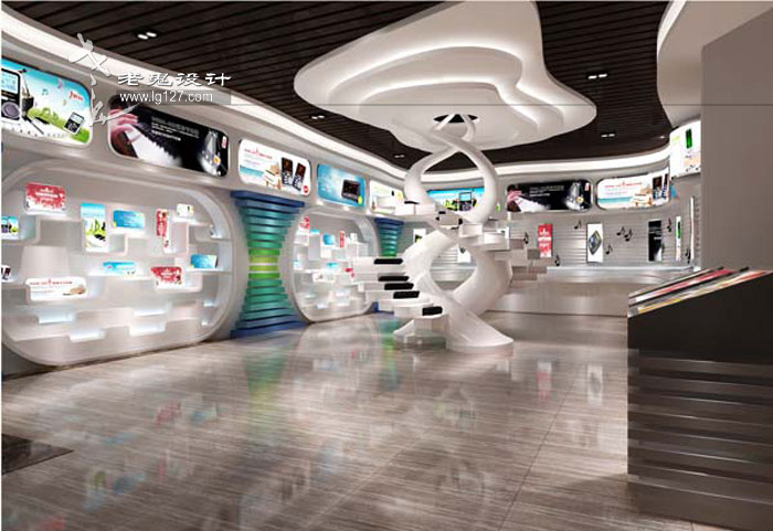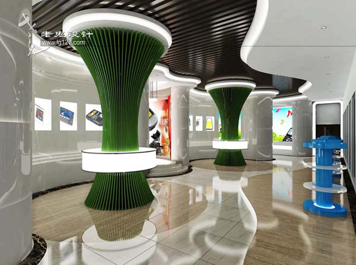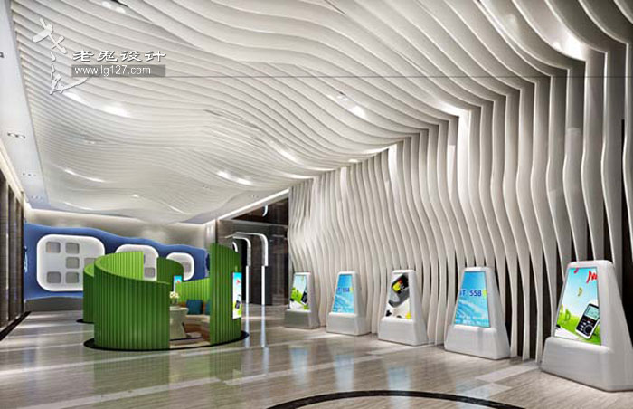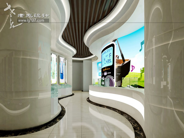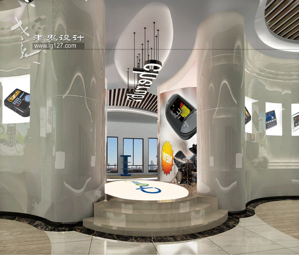 在造型上也十分講究,曲線的運用、錯落有致的方格形體以及搭配足夠的光源,不僅形成一種光與影的對比感,而且充滿了韻律與節奏感,步其間,首先可以在視覺上享受那份即現代又科技,且時尚的骨感;其次,以靜烘托動的表現手法,讓你在聽覺上,可以聆聽音樂的節奏感;在嗅覺上,也已經能赤裸裸的嗅到公司產品的特性,仿佛置身于電子產品之中。