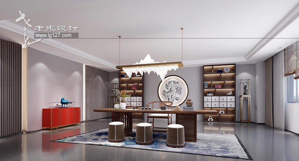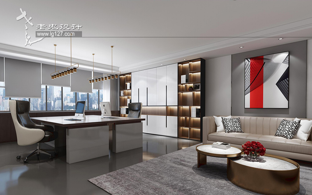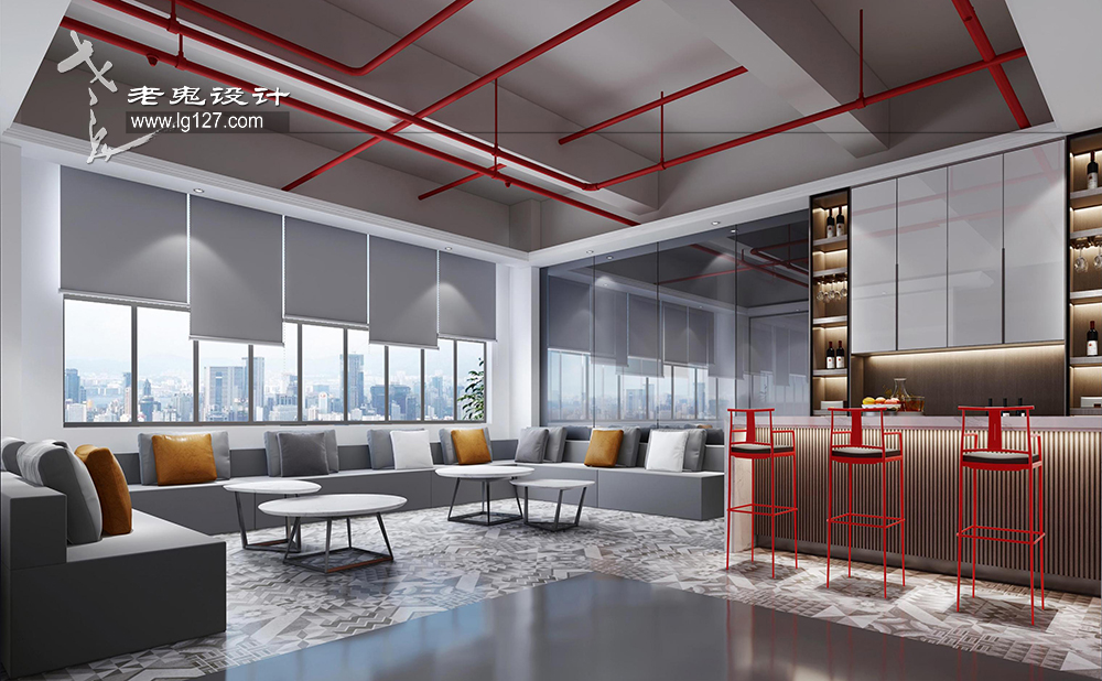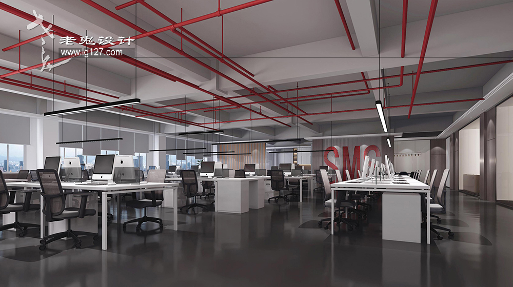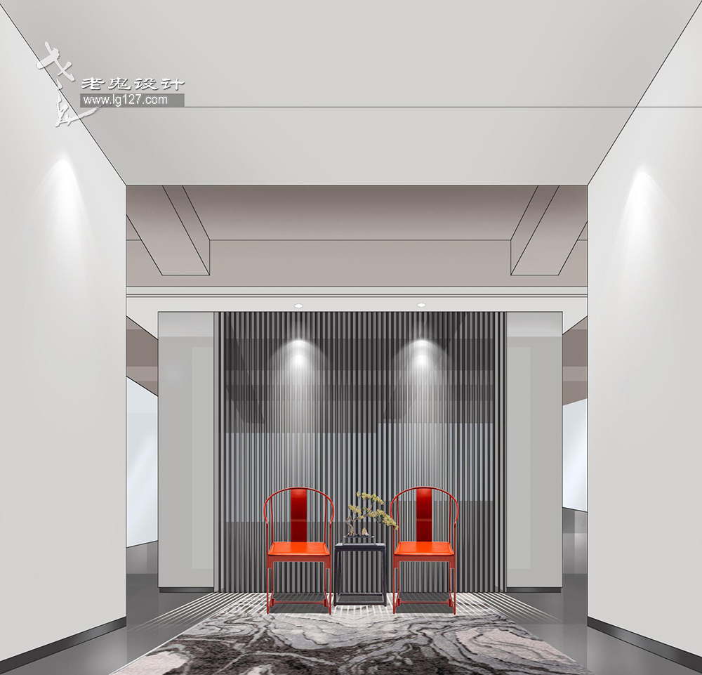 整個辦公設計在風格上,老鬼設計事務所為其打造一種后現代的極簡風,適當融入了新中式的元素,同時混搭工業風。辦公空間設計的基調定義為黑白色調,利用中國元素之紅色、金色張揚的艷麗色彩點亮空間色彩,簡潔干練和理性,流露出了人們內心對崇尚自然、國韻、禪悅、幽心的生活向往。