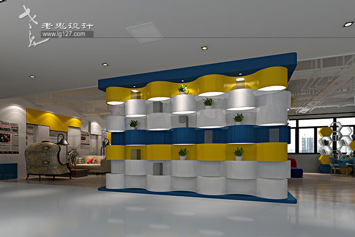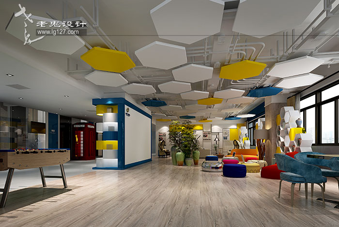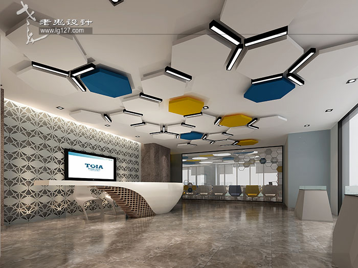 大堂的設計保持開闊的視覺感受。頂部的設計采用了多邊形組合的造型設計,看上去,更像是一個個被放大的蜂巢。錯落中有節奏。這種想法最初源于凱文·凱利的《失控》中所提到的蜂群效應。借此,我們用以表達移動互聯網時代下的“連接”思想。六邊形的藍色和黃色塊狀結構設計,提升了頂部天花的美學效果,燈管隱藏在凹槽之中,在提供實用性的照明功能之外,也成為了裝飾的一部分,前臺后墻的設計同樣用造型拼貼來實現墻面的質感,圍繞著前臺的周邊空間保持著干凈清爽的設計感,以求突出前臺的主體地位。