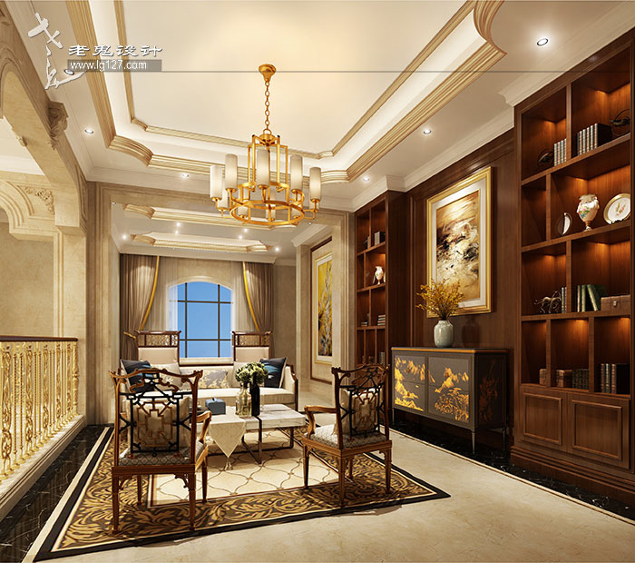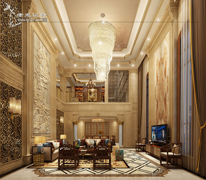 挑高的客廳空間里,歐式的造型,貴族的華貴,搭配著中式的深色木質家具,富有文化深蘊,亦中亦西,打造出一個富有韻味又時尚精致的溫馨空間。空間格調華貴,質感十足。